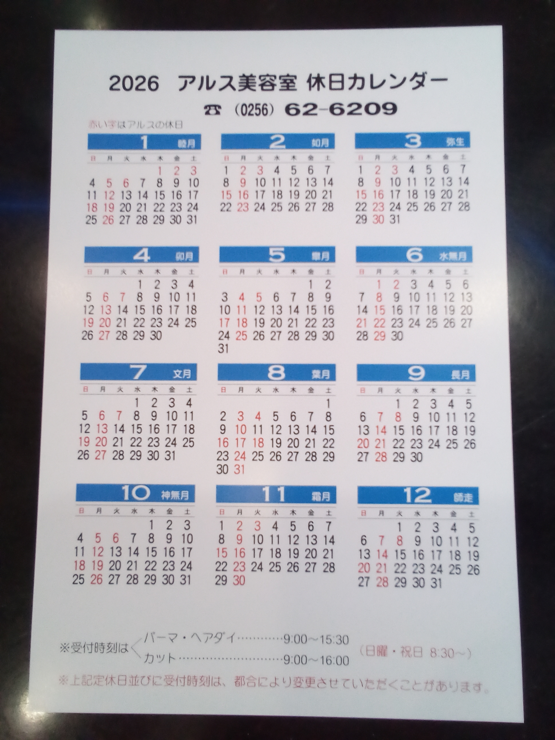 2026年度🎶定休日カレンダー🎶です。